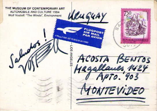 Vostell viaja a Montevideo para presentar un videoarte en el Museo de Arte Contemporáneo de El País. Hablando muy fluidamente el castellano intercambiamos ideas sobre el trabajo de video arte, le comente que el que había empezado a trabajar en Uruguay era Álvarez Cozzi y que yo estaba incursionando en el tema luego de realizar un par de cortos en 8 mm. Que aquí solo había cámaras en VHS y trabajamos con dos reproductores para poder realizar la edición de choque por no tener acceso a islas de edición. El me pregunta si teníamos un grupo y un lugar donde nos reuníamos y si poseíamos asistencia del gobierno. Le cuento que estábamos en una dictadura militar y que habían clausurado la Escuela de Bellas Artes.
